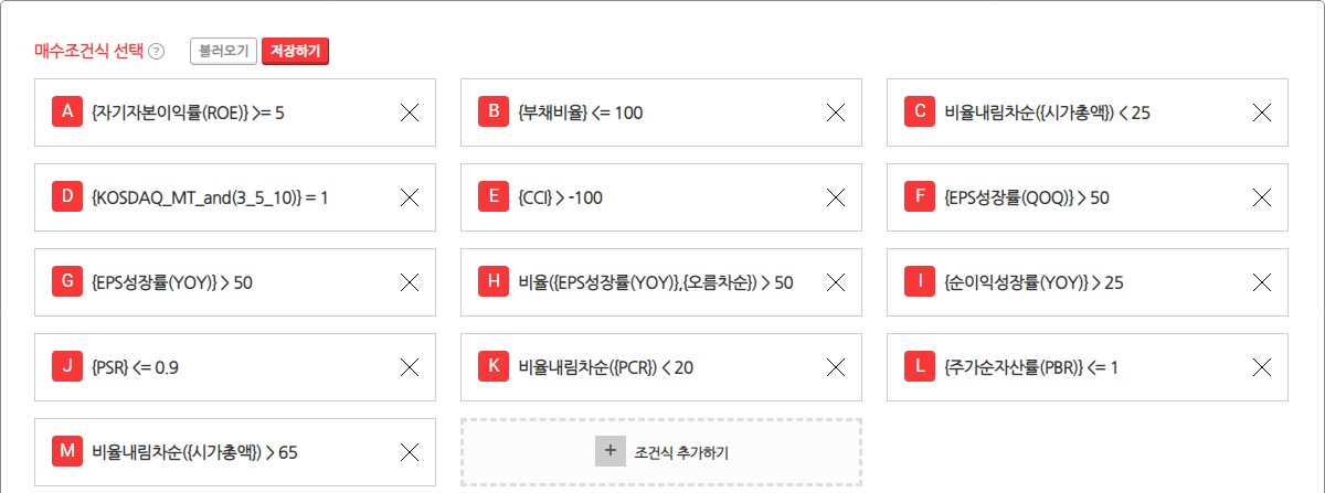 ※ 우선순위와 기본설정 및 and, or 조건은 공개하지 않습니다. 매수, 매도 조건만 공개합니다. [참고로 제 전략의 조건은 단순한 편입니다.] 이유는 모두 다 공개한다면 참고하는 사람도 운영하는